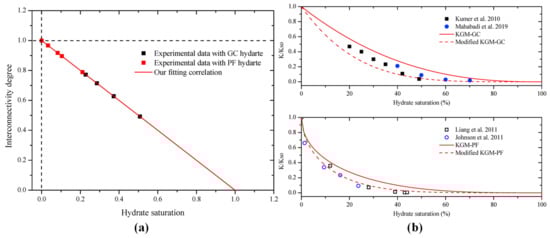 The experimental permeability values shown in Figure 6 show that in excess-gas condition or excess-water condition, data scatter widely due to the difference in measurement methods and the uncertainty in hydrate formation. It is worth mentioning that some measured permeability values fall outside the predicted ranges of two analytical models (i.e., PCTM and KGM). In addition, the PCTM [23], KGM [23], and Dai and Seol’s model [40], shown in Figure 6, does not take into account the effect of capillarity on nucleation patterns.