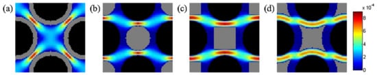 Kang et al. [53] conducted LBM flow simulations considering the capillary effect during hydrate formation and growth and different shape of pore channels due to the different hydrate pore habits to study the evolution of water permeability. A salient observation from flow simulation results (Figure 7) is that for both grain-coating and pore-filling cases, the normalized permeability is higher when the capillarity is considered than when it is not considered.