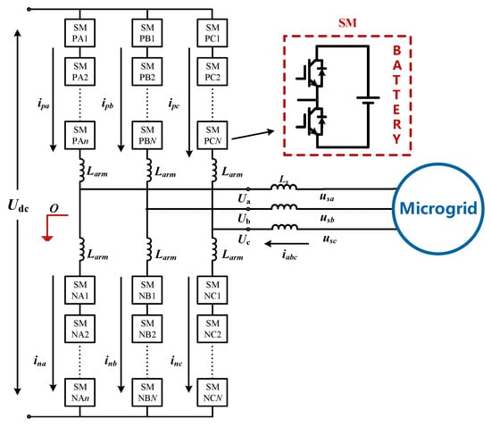 The topology of an MMC-BESS is shown in Figure 1, where several SMs and one filter inductor are series-connected. Batteries are distributed into SMs as DC power sources.