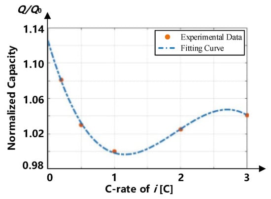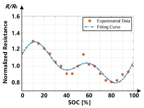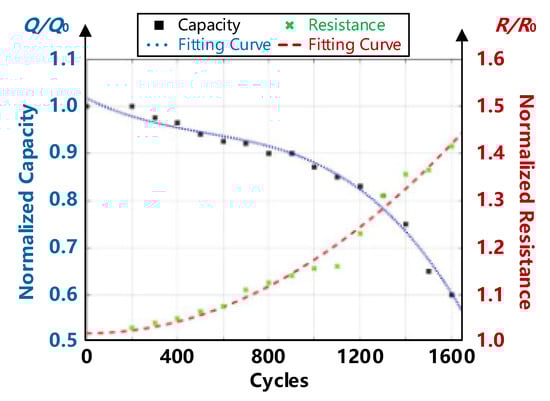 With the cyclic charging and discharging of batteries, the capacity of the battery will decrease, and the internal resistance will increase. The function of the resistance and capacity of the calculated results for lithium batteries in Figure 4, Figure 5 and Figure 6 are shown in Equations (7)–(9) [,,,,,,]: