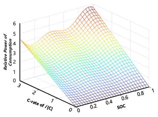 So, the capacity can be calculated from Equation (14), and the energy consumption of a single battery can be calculated from Equation (15), where t1 is a function of the SOC and current. The battery is charged with 0–3 C current, and the power of consumption with various SOC is shown in Figure 7: