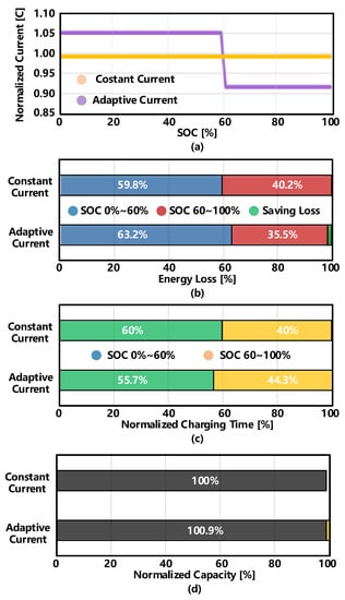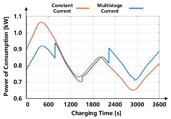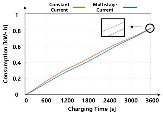 where t is the charging time, and Qbat is the capacity of the battery. The effect of the charging method is theoretically verified as supported by the simplified example (M = 2) shown in Figure 8. Once the value of the SOC interval is determined, the amplitude of i is determined by Equation (17). As shown in Figure 8b,c, the energy consumption of a battery of the proposed multistage current charging method is reduced by 1.3% compared with that of the constant current charging method. Moreover, the charging capacity for the proposed multistage current charging method is increased by 0.9% compared with that of the constant current charging method, and the total charging time for both methods is the same.