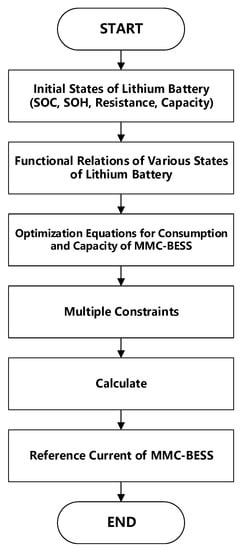 where Wloss_i is the energy consumption of the ith battery, and N is the number of SMs. Therefore, an optimization function Equation (18) is established to calculate the energy consumption of the system, which takes the minimized energy consumption of the system and the corresponding power distribution as the result, with charging time as the constraint. The flow charts to calculate the reference current of an MMC-BESS and the control strategy of an MMC-BESS are shown in Figure 9 and Figure 10, respectively: