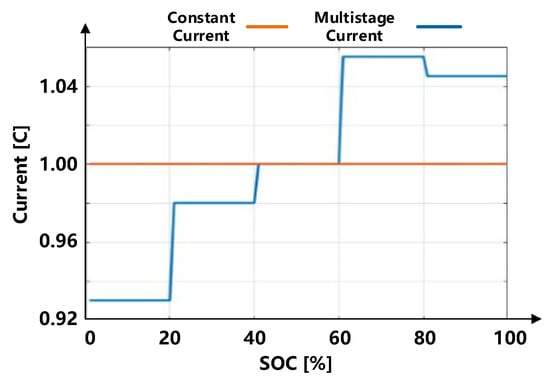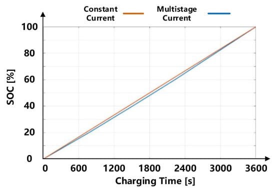 Since the currents of two methods in various SOC are different, the charging rate of the multistage current charging method is lower than that of the constant current charging method until the current exceeds the constant current, according to Equation (4). Eventually, the battery is fully charged at the same time.