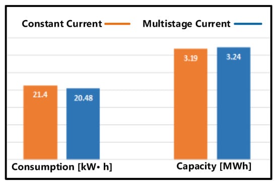 The formula expression of SOC is similar to the energy consumption, as shown in Equations (4) and (15). The trend of energy consumption is consistent with SOC, but the energy consumption and capacity are different, representing the differences between the variables of internal resistance and capacity, according to Equations (7)–(14). Therefore, the energy consumption of the multistage current charging method decreases, but the capacity increases when the battery is fully charged.
