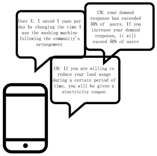 To improve the community benefit and reduce the uncertain behavior of users in response, the CM will publish some information in the information exchange center in Figure 1 to guide users to make energy use decisions. Residents will receive messages similar to Figure 2. This information potentially affects the electricity behavior of user through psychological factors [28]. Such messages typically contain three broad categories: the first is an inducement message from a demand response user, which is usually provided by a user who has successfully participated in demand response and received additional benefits; the second type is the guidance information issued by the community manager, such as energy coupons. For example, if a customer uses 5% less electricity in a certain period, the customer can receive an energy coupon to offset the electricity bill. The third type of information is the comparison information among users, which usually exploits the comparison psychology among users to improve their energy consumption habits. This paper attempts to increase user engagement by using the above information in order to guide the interaction between users. In addition, to ensure users’ privacy, the community manager will only distribute information related to the user’s authorization. The community manager will be responsible for the leakage of the rest of the information.
