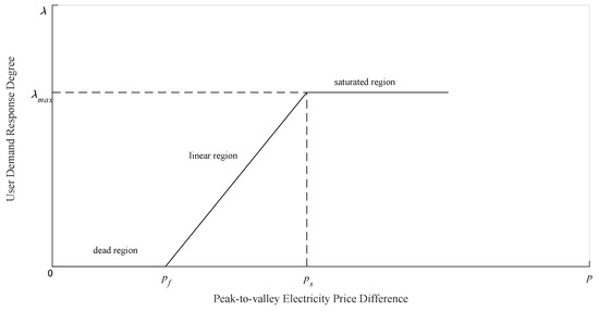 According to the principle of consumer psychology, there is a minimum perceptible difference for the user’s stimulation. Within the range of this difference threshold, the user has no response or the response is minimal (dead region); beyond the range of dead region, the user will respond, which is related to the degree of stimulation (linear region); users also have a saturation value for incentives. Beyond this value, users will not respond (saturated region). Different types of users have different response curves. A piecewise linear function often represents the response process to simplify the problem. The user responsiveness of different levels will eventually be reflected in the different parameters: peak-to-valley electricity price difference p, start threshold and saturated threshold . is the level of user demand response and Maximum demand response of users [8].
