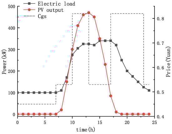 In order to further illustrate the influence of herd mentality on the flexible load scheduling of community users, a community building with 7 commercial and residential buildings is taken as an example to verify the scheduling strategy proposed in this paper. Each building is equipped with roof PV, and the installed capacity ranges from 50 kWp to 100 kWp. The time-of-use electricity price in the community is shown in Figure 5. The scheduling time period T is 24 h and the time interval is 1 h. The maximum proportion of shiftable load of all users is 30%. The value of M is assumed to be a random number between [0.04, 0.1] based on the herd mentality utility generated by the selected users for the demand response. penalty price is 2 yuan/kWh. The parameters of ES installed by users are shown in Table 2. The user’s load forecast curve and PV forecasting are shown in Figure 5.