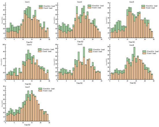 It is assumed that users 1–4 will share some energy habits in the information center, and users 5 to 7 are users with a strong awareness of autonomous energy use. Therefore, the preference coefficients of users 1–4 are set to 10, and the preference coefficients of users 5–7 are set to 80, 90, and 100, respectively. According to Equation (21), the load usage of each user in the community is calculated, as shown in Figure 6.