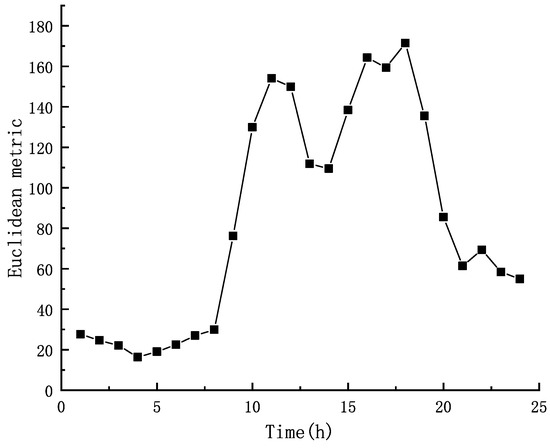 In addition, considering that users 1–4 also intensively use flexible load from 11:00 to 14:00 at noon, the above results cannot prove that users 5–7 produce herd behavior during this period. Therefore, this paper judges whether there is a herd mentality by calculating the Euclidean distance of load of users 1–4. The smaller the Euclidean distance is, the more similar the behavior between users is, and vice versa. The Euclidean distance is shown in Figure 8. Combined with the analysis of users’ energy use behavior in Figure 6, it can be seen that the Euclidean distance between users 1–4 is smaller in the morning when users 1–4 concentrate on using flexible load, and this phenomenon may have a greater influence on the energy use behavior of users 5–7. Based on the analysis of herd mentality, it is more likely that users will change their energy use habits if other users have similar energy use behaviors. In addition, users 1–4 also use flexible load at noon, which does not necessarily produce the herd mentality; on the one hand, due to the higher tariffs at this time, customers 1–4 are unlikely to actively use flexible load, which may be due to the existence of a certain percentage of PV surplus; on the other hand, the possibility of herd mentality is weakened by the large variation in users’ energy use behavior.