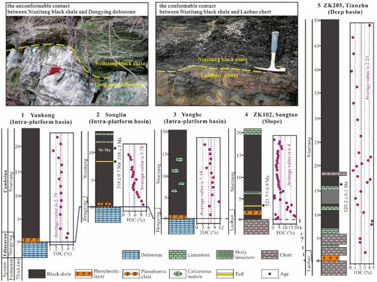 Contact relationship between the Ediacaran and Cambrian strata, and the stratigraphic columns and TOC contents of the Early Cambrian black shale. The ages are cited from [47,48,49].
