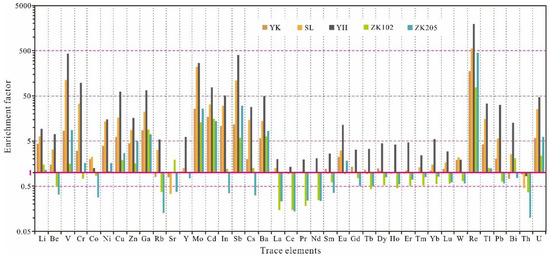 where X is the target trace element (such as Ni, Ba, Mo, U, and V), and UCC is the average composition of the upper continental crust [50]. The calculated results show that (1) the shale samples in this study are rich in Ni, Mo, Re, U, V, Cr, Cu, Zn, Ga, Cd, In, Sb, and Ba in contrast to the upper continental crust (Figure 3); and (2) the shale samples indicating the intra-platform basin setting have higher enrichment factors than the shale samples correlated to the slope and deep basin settings (Figure 3).