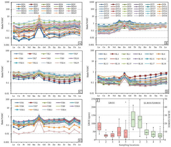 Rare earth element (REE) distribution patterns for the Early Cambrian black shale, and REE contents and light REE to heavy REE (LREE/HREE) ratios. (A) ZK205 well, (B) ZK102 well, (C) Yankong section, (D) Songlin section, (E) Yonghe section, (F) REE contents and light REE to heavy REE (LREE/HREE) ratios (1—Yankong section, 2—Songlin section, 3—Yonghe section, 4—well ZK102, and 5—well ZK205. Box-plot: asterisks are the maximum and minimum values, hollow square is average value).