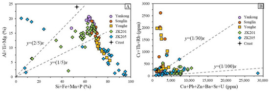 Sediments affected by hydrothermal activities are characterized by (1) relatively low REE abundances, (2) pronounced enrichment of HREEs relative to LREEs, and (3) positive Eu anomalies [51,53,58]. The REE distribution patterns and the ranges of the REE abundances and LREE/HREE ratios of the shale samples are shown in Figure 4. The samples from the two wells (wells ZK102 and ZK205) and the Yonghe section have relatively low REE abundances and ∑LREE/∑HREE ratios, and large positive Eu anomalies, confirming the effects of hydrothermal activities on the Early Cambrian Niutitang black shale from the intra-platform basin margin, through the slope, to the deep basin. It should be noted that the samples from the Songlin section (intra-platform basin setting; Figure 1 and Figure 2) also have relatively low REE abundances and positive Eu anomalies. However, these samples have high proportions of LREEs and Cr+Th+Rb concentrations (Figure 5B), suggesting that their positive Eu anomalies and low REE abundances did not originate from hydrothermal activities. The samples from the intra-platform basin setting may have been significantly affected by the terrigenous flux.