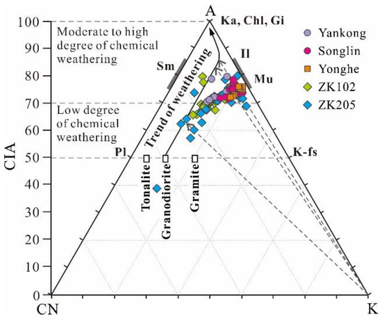 A-CN-K ternary diagram showing the diagenetic K-metasomatism of the Early Cambrian black shales. The associated range of the CIA values is also indicated. A—Al2O3; CN—CaO* + Na2O; K—K2O; CIA—chemical index of alteration; Ka - kaolinite; Chl—chlorite; Gi—gibbsite; Sm—smectite; Il—illite; Mu—muscovite; Pl—plagioclase; and K-fs—K-feldspar.
