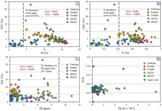 Plots of TOC versus (A) Al, (B) Ti, and (C) Th, and (D) plot of Ti/Al versus Th/Al. CC1—correlation coefficient of each element concentration and TOC content of all the black shales (including Yankong, Songlin, and Yonghe sections and wells ZK102 and ZK205); CC2—correlation coefficient of each element concentration and TOC content of black shales from the intra-platform basin (including Yankong, Songlin, and Yonghe sections).