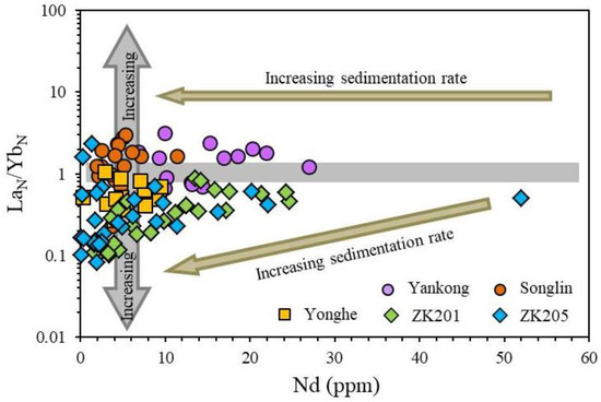 Rare earth elements (REEs) are transported into the ocean with suspended particles and detrital minerals, and the residence time of these particles and minerals in the sea water determines the degree of differentiation of the REEs [66]. Generally, a fast sedimentation rate corresponds to a moderate LaN/YbN ratio and a low Nd concentration, while a slow sedimentation rate results in differentiation between La and Yb and the enrichment of Nd [66,67,68,69]. As shown in Figure 8, wells ZK102 and ZK205 have lower LaN/YbN ratios and approximately equal Nd concentrations compared to the Yankong and Songlin sections, indicating that the sedimentation rate in the slope and deep basin settings was slightly faster than that in the intra-platform basin during the Ediacaran–Cambrian transition stage. This result conflicts with the general belief that the intra-platform basin has a faster sedimentation rate than the slope and deep basin settings. Thus, we speculate that the higher Yb concentration in shale samples from wells ZK102 and ZK205 is the result of hydrothermal activities and upwelling events.