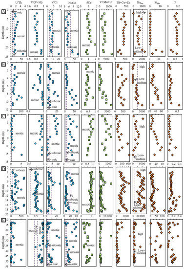 Uranium (U) and V are redox-sensitive elements, and they are generally enriched under anoxic and euxinic conditions [64]. Cr and Th, unlike U and V, are not redox-sensitive elements and remain insoluble in the marine environment [78]. Therefore, the U/Th and V/Cr ratios can indicate oceanic redox conditions. Generally, U/Th > 1.25 represents anoxic conditions, and ratios as low as 0.75 represent strongly oxidizing conditions [87]. For V/Cr, >4.25 indicates anoxic conditions, 4.25–2 indicates suboxic conditions, and <2 indicates oxic conditions [81]. The V/(V + Ni) and Ni/Co ratios can also indicate redox conditions. It is widely accepted that both V/(V + Ni) and Ni/Co increase from oxic [V/(V + Ni) < 0.45; Ni/Co < 5], through suboxic [0.45 < V/(V + Ni) < 0.6; 5 < Ni/Co < 7], to anoxic [0.6 < V/(V + Ni); 7 < Ni/Co] conditions [64,78,81,88,89]. In addition, δCe > −0.1 and <−0.1 indicate anoxic and oxic conditions, respectively [90]. Since V, Mo, and U are all enriched in sediments deposited under anoxic to euxinic conditions but are dissolved and transported by oceanic water under oxic conditions, the V+Mo+U content can be used to effectively evaluate the evolution of the paleoredox conditions.