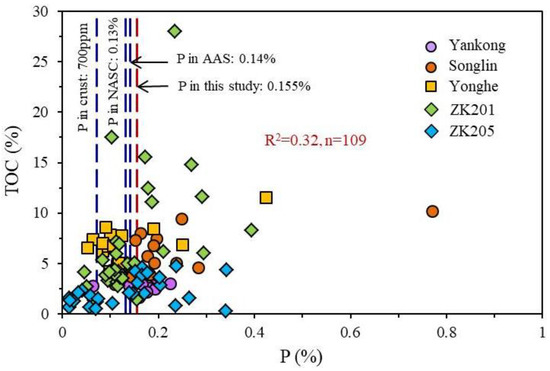 Phosphorous (P) is one of the essential nutrient elements for the growth of marine organisms on both short and long timescales, and its concentration in sediments has been used as an indicator of paleoproductivity [79,80]. In the studied shale samples, the P contents are 0.015–0.77% (Figure 9 and Figure 10), which are higher than the content in the crust (700 ppm). These results suggest that the Upper Yangtze Region was a productive and dynamic region during the deposition stage of the Early Cambrian Niutitang black shale. As shown in Figure 10, there is a moderate correlation between P and TOC (R2 = 0.32, n = 109), and this phenomenon probably indicates that during the deposition of this black shale, the primary productivity was high, which controlled the organic matter production.