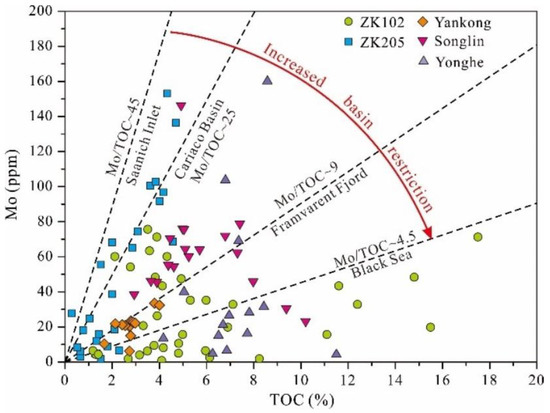 As shown in Figure 12A, the Mo/TOC ratios of the shale samples from the intra-platform basin range from 0.37 × 10−4 to 29.74 × 10−4, while the ratios of the slope and deep basin shale samples vary from 0.19 × 10−4 to 94 × 10−4, suggesting that (1) the intra-platform basin was more restricted than the deep basin, and (2) the water mass restriction of the slope and deep basin regions changed more frequently than that of the intra-platform basin during the deposition of the Early Cambrian Niutitang black shale.