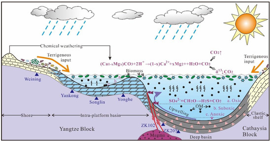 The Yangtze Block experienced intense extension and block tilting, leading to the development of an intra-platform basin on the paleohigh surrounded by a large-scale open siliceous deep basin. As a result, during the terminal Ediacaran–earliest Cambrian stage of the Yangtze Block, the intra-platform basin, slope, and deep basin sedimentary setting belts were distributed from northwest to southeast (Figure 1) [14,32,47]. During this stage, upwelling events brought a large amount of nutrients to the shallow water regions, resulting in the phytoplankton in the shallow water flourishing [14,26]. In addition, organisms such as worms, sponges, and bacteria exploded around the hydrothermal centers (especially the large faults in the slope region) [26,53]. As a result, the intra-platform basin margins and slope had significantly higher primary productivities than the inner intra-platform basin (Figure 9).