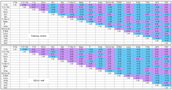 Correlation coefficients of TOC content with various geochemical proxies (Purple mean positive correlation, and blue mean negative correlation).