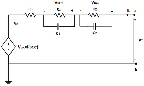 Various battery models have been examined in the literature based on the degree of precision desired and the practical use, including electric vehicles. In its corresponding circuit, an efficient dynamic model with two components, the resistance and capacitor (RC), was presented [43]. The n-RC model [44] is a frequently utilized circuit framework for Li-ion batteries, consisting of parallel RC branching, which is linked in series for n times. The corresponding circuit, shown in Figure 1, is a simplified form with two RC branches.