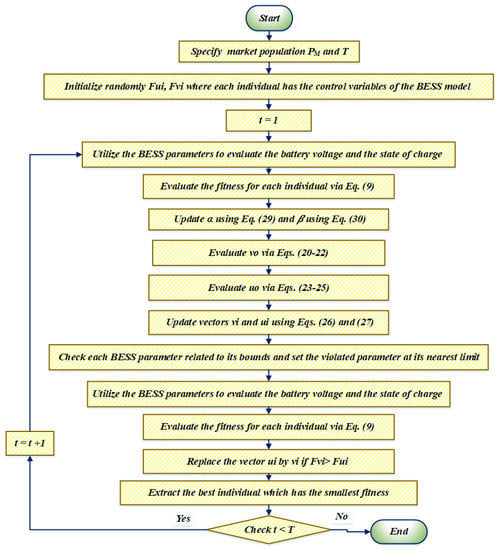 The key stages of the SDA to handle the effective and practical parameters of BESSs, based on the Li-ion batteries with a nonlinear dynamic model, are represented in Figure 2. As seen, the SDA is straightforward to deploy and simply requires a few settings to be altered. Its temporal context is governed by the number of markets, the dimensionality of the task, the maximum iteration, the RWS, the number of commodities, and the price adjustments within every iteration. As a result, the SDA gives distinguishing exploratory and exploitative features by altering the demand and supply ratios α and β. The phases of the SDA implementation for estimating the optimum BESS variables are as follows: