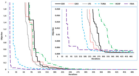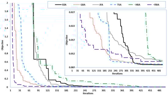 Table 3 and Figure 11 show that the SDA outperformed the others since it found the minimum objective value of 0.004411594. On the other side, the GBA, JFA, TSA, HBA and FBIA achieved the counterpart objective values of 0.004448455, 0.004481826, 0.004487704, 0.00468358 and 0.005049191, respectively.