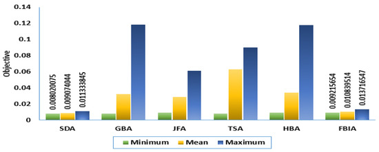 As illustrated in Figure 5, the SDA achieves the least indices of the maximum, mean and minimum objective values of 0.011333845, 0.009074044, and 0.008020075, respectively. Secondly, the FBIA achieves little higher indices of the maximum, mean and minimum objective values of 0.013716547, 0.010839514, and 0.009215654, respectively. Based on these indices, the worst maximum value is due to the HBA and GBA, which has the highest objective values of 0.117968077 and 0.118542406, respectively. Nevertheless, Figure 6 depicts the standard deviation comparison for the SDA, GBA, JFA, TSA, HBA and FBIA. As shown, both the SDA and FBIA provide the least area of 1%. With a highly accurate comparison, the acquired standard deviation is 0.001131406, based on the SDA, whilst the acquired standard deviation is 0.035765609, based on the FBIA. This assessment shows the SDA gave a better performance than the FBIA, with more than 30% accuracy. On the other side, the other techniques can be ascendingly ordered as JFA, HBA, GBA and TSA, where they have percentages of 15%, 26%, 28% and 29%, respectively.