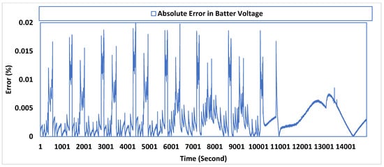 Furthermore, Figure 9 shows the experimental and predicted SOCs for the Li-ion battery properties by using the suggested SDA. The relative inconsistency of the predicted SOC utilizing the indicated SDA for the Li-ion battery properties is also shown in Figure 10. The high success of the suggested SDA is described between the experimental and estimated SOCs in both figures, since the maximum absolute error does not exceed 0.0006.