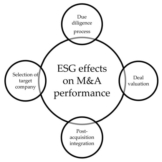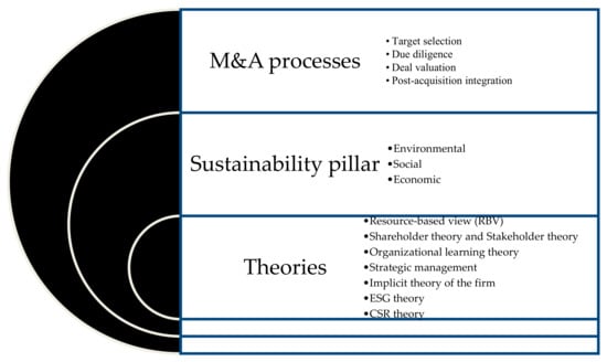 Vastola and Russo [] define M&A as progressively intertwined with sustainability objectives and evidence this perception with well-known M&A deals of socially and environmentally advanced organizations. The authors follow a resource-based view of sustainability and an implicit theory of the firm that attributes primacy to shareholders. Their findings imply that sustainability outcomes are frequently defined in terms of capital or resources, which are usually retrieved during M&A events.