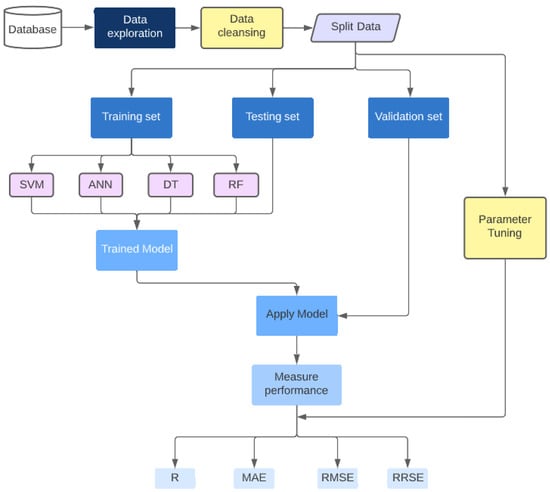 The following is a preliminary outline of the proposed method. Figure 1 show the flowchart of the followed methodology, as a first step in the procedure, the experimental open-pit mine’s acquired historical data are cleaned. After then, the main dataset is split into training, testing, and validation sets. The dataset is then subjected to four machine learning algorithms (SVM, ANN, DT, and RF) using the Rapid Miner tool. Four metrics, the correlation, absolute error, relative error, and mean square, are used to generate and evaluate the forecast. The parameter tuning process takes place during the whole procedure in order to generate the best performance of the four models. In the following subsections, we present the studied dataset and the utilized algorithms in this study.