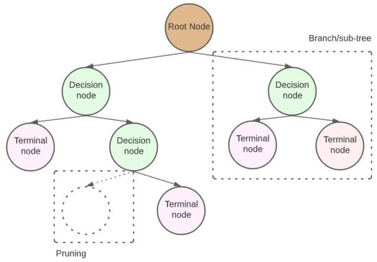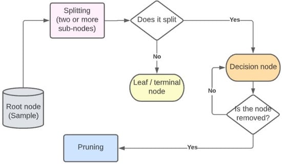 The Decision Tree (DT) approach (Figure 5) divides data into categories by using a tree-like flowchart. Decision Trees are a flexible procedure that can learn from a larger amount of training data [56]. The DT is easier to understand than other data-driven methodologies, and its application does not necessitate significant calculation understanding. However, it frequently leads to significant deviations between predictions and actual results. DT is better suited to forecasting category characteristics than estimating numerical variables [57].