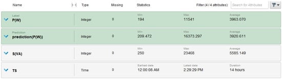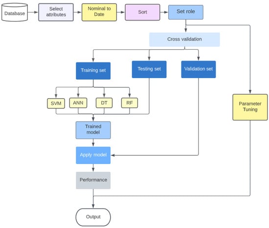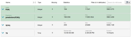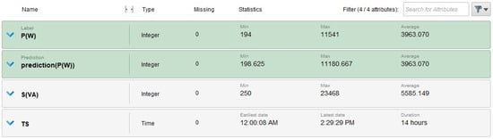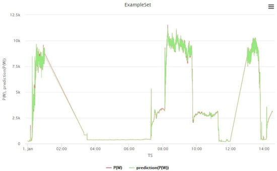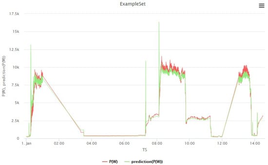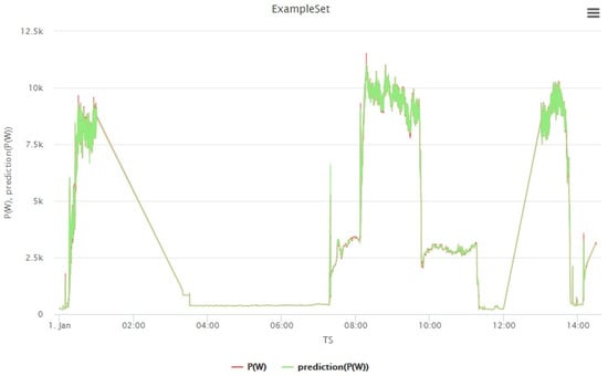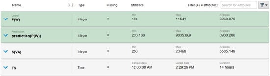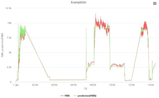 The stream of the process is depicted in Figure 8. The dataset comprises several attributes such as current, voltage, frequency, power, and power factor. The Select Attributes Operator selects a subset of a dataset’s Attributes while removing the rest. The date-time, apparent power, and active power are the attributes we have chosen in this situation. We used the Nominal to Date Operator to convert the date-time attribute’s type so that it could be used later because it was deemed a nominal parameter in the Rapid Miner. This operator converts the selected nominal attribute into the desired date-time type. Date and/or time values are converted from nominal values. This conversion is conducted with respect to the specified date format string. The Sort Operator is used to sort the input data set by date-time attribute in ascending order. Set role Operator changes the role of one or more Attributes, in our case we set the active power as the prediction target. Optimize Parameter (Grid) is used to tune the subprocess parameters for best performance outcome. Cross validation is used to estimate a learning model’s statistical performance. The dataset is split into a training and testing set within this operator, as seen in Figure 6. During the training phase, we deployed four different models: SVM, ANN, DT, and RF. In the testing phase, we apply the model on the testing Dataset using the Apply Model Operator. The trained model is then applied to the validation set to evaluate the model and measure its performance using the Performance Operator.