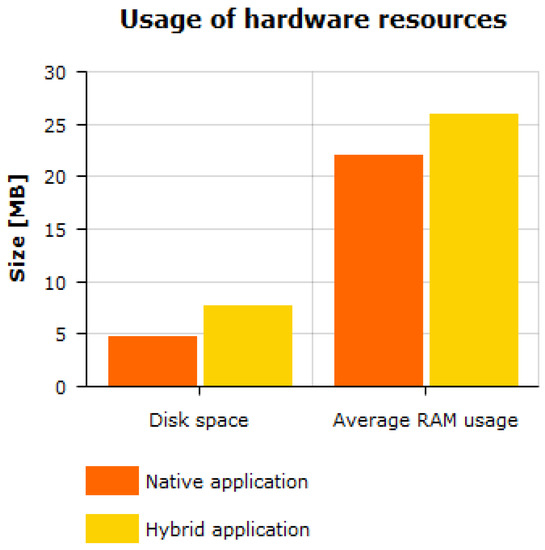 The efficiency of mobile devices is increasing very quickly nowadays. This does not mean that the usage of resources is not important for developers. The tests indicated that hybrid applications use slightly more RAM and disk space. The differences could be more noticeable in the case of more advanced projects. In the case of simpler applications, this factor is rather irrelevant (assuming that the applications do not cause memory leaks).