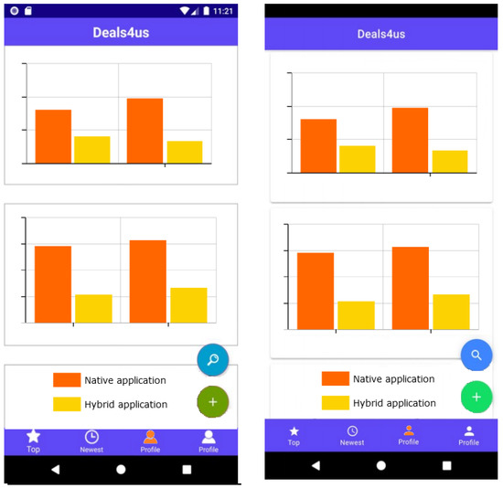 The native application has direct access to all of the user interface components available in the Android system. The hybrid application built in Ionic could use multiple elements which had almost the same use as those available in the native one (see the comparison presented in Table 7). This means that the final design of a mobile application can be very similar in both cases (presented in Figure 6). Therefore, the user interface should not be a determinant of the choice between native and hybrid applications.