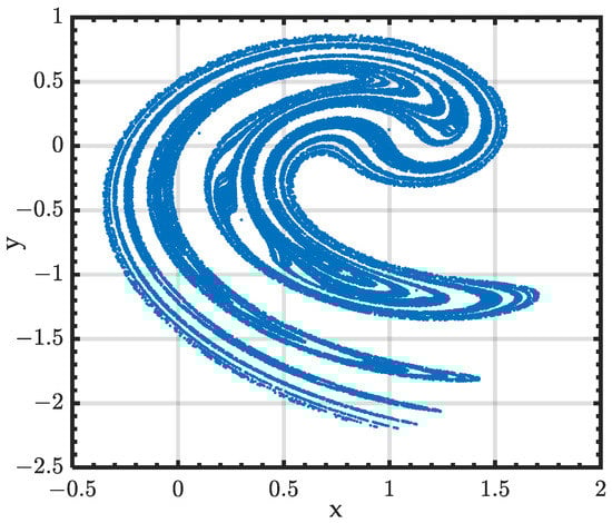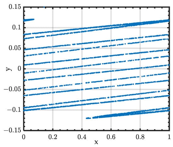 In order to exhibit a chaotic behavior, the following typical values of the control parameters of the Zaslavsky map are often employed []: , , and . In Equation (26), e is the exponentiation. The 2-D plot of the Zaslavsky is given in Figure 2.
