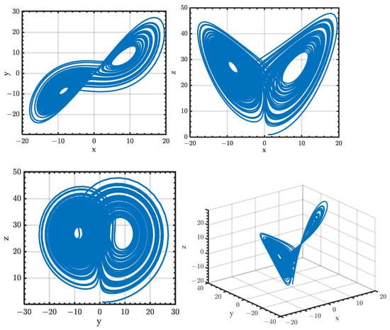 where x, y, and z are the system state variables. , , and represent the system parameters. As presented in [], the Lorenz map can have a strange chaotic attractor when these parameters are set as follows.