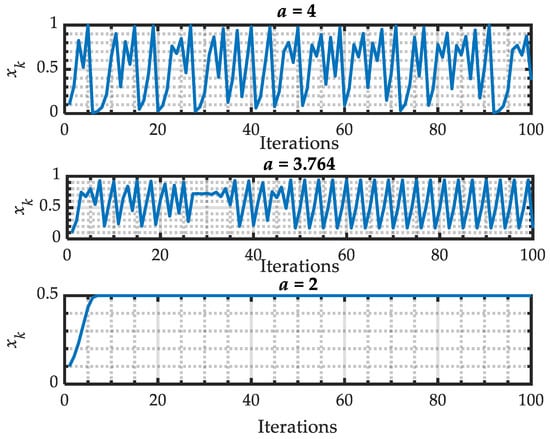 Figure 4 draws up the 1-D behavior of the sine map for , , and . It is worth mentioning that Figure 4 shows that the chaotic sine map is sensitive to its parameter a. In fact, it is clear that sequence is a periodic and non-convergent for . However, after few iterations, it becomes periodic for and convergent for . Thus, the two last values of parameter a cannot provide chaotic behavior for the sine map.