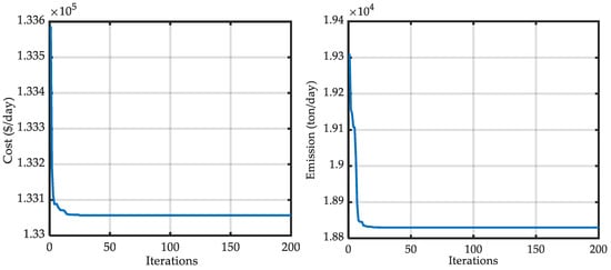In this study, the DEED problem is solved for a power network with N thermal units over the scheduling period where T is the number of hours. Therefore, the total fuel cost and total emissions can be expressed as given in Equations (3) and (4), respectively.