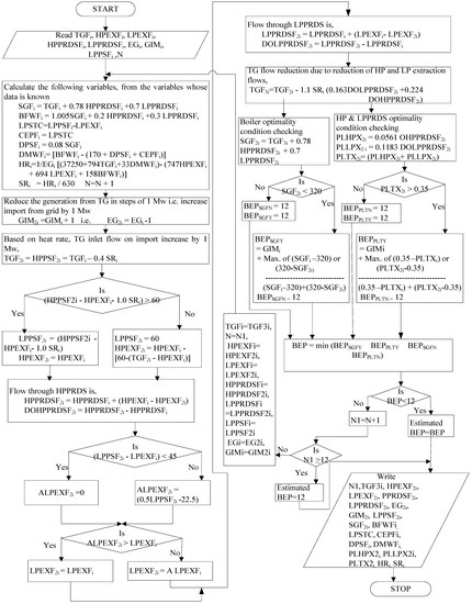 In the process of developing mathematical modeling, the literature was reviewed to establish theoretical concepts and related governing equations. Literature on cogeneration concepts [8], heat rate establishment of CHP plants [9], thermal analysis of thermal plants [10], and equations governing power generation in turbines [11,12] is extremely helpful in formulating the mathematical equations and developing an algorithm to find BEP by mathematical modeling. Similarly, literature on concepts of internal rate of return/Newton Raphson’s empirical formula [13,14] guided precise estimation of the BEP between two RE generation levels with different optimality conditions status. The theoretical method developed based on mathematical modeling is the first attempt based on thermodynamic equations and the same philosophy can be adapted to similar cogeneration plants. The major contribution of this research is the development of a standard theoretical approach to BEP estimation.