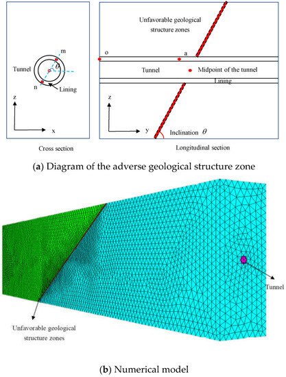 Since the beginning of the 21st century, with the increase in infrastructure construction projects around the world, the number of tunnel projects has gradually increased. Sometimes, tunnel engineering inevitably requires passing through adverse geological structure zones [1], especially the railway routes in the high-speed train projects. However, the part of the tunnel passing through an adverse geological structure zone is prone to structural crack and collapse under earthquakes, such as the 1995 Hanshin earthquake in Japan [2], the 1999 Taiwan Jiji earthquake in China [3,4], and the 2008 Wenchuan earthquake in China [5,6,7], which caused varied degrees of damage to the tunnels. Therefore, it is of great significance to study the dynamic response of tunnels crossing the adverse geological structure zone under an earthquake.