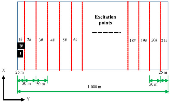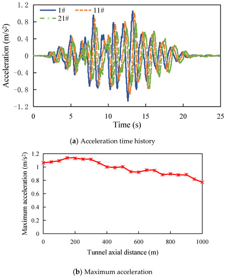 In order to simplify the calculation, it is assumed that the ground motion acceleration time-history input at the bottom of the model within a range of 50 m is consistent. Therefore, based on displacement benchmark checking, there are 21 acceleration–time history curves generated. Figure 3a is the acceleration–time history curves of the excitation points 1#, 11#, and 21#. It can be seen from the figure that the waveform of the acceleration time history of each excitation point is similar. The time history shows a delay effect, and the peak acceleration is gradually reduced, as shown in Figure 3b. Therefore, the generated acceleration–time history curves can show the wave-passage effect and attenuation effect. Because the axial direction of the tunnel is the y direction, the ground motion is the y direction, and the input method adopts vertical input, as shown in Figure 4.