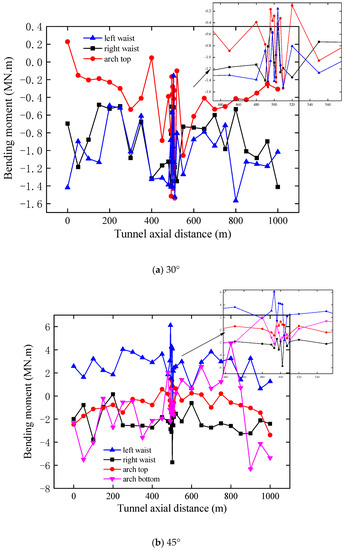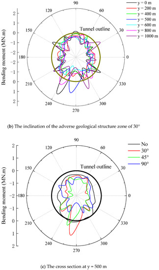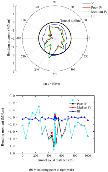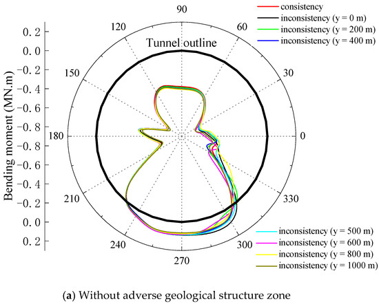 Figure 9 shows the distribution of the peak bending moment of the lining at the location of the y = 500 m section with different lithologies of the adverse zone. As can be seen from Figure 9a, the distribution of the lining moments with different lithological adverse zones is the same in all directions in the tunnel. Like the case without the adverse zone, the lower left side of the tunnel lining is under tension when there is an adverse geological structure zone, while the other side is under compression. Generally, the lining bending moment is larger in the case of the adverse geological structure zone than that without an adverse zone, and the worse the lithology of the adverse zone, the larger the lining bending moment is. Comparing the change of the peak bending moment along the tunnel axial direction at the right waist monitoring point with different lithologies of the adverse zone, as shown in Figure 9b, it can be found that the change degree of the lining bending moment with the adverse geological structure zone is significantly bigger than that without the adverse zone, and it presents a strong inconsistency. Except around the location of the adverse zone, the trend of the peak lining moment along the tunnel axial direction is the same for different lithologies in adverse zones. Notably, around the adverse zone, the worse the lithology of the broken zone, the greater the bending moment of the lining is, but there is little difference in size, at about 0.2 . It means that the lithology of the adverse zone has less influence on the tunnel-lining bending moment.
