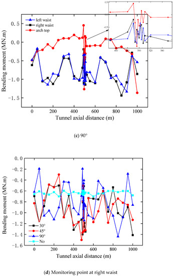 Figure 6 shows the variation of the peak bending moment of the lining monitoring points (including the left and right waist, top and bottom) along the tunnel axis with different inclinations of the adverse zone. As can be seen from Figure 6a, when the inclination angle of the adverse geological structure zone is 30°, the bending moment of the monitoring point at the top of the tunnel is smaller than that of the other monitoring points. However, around the adverse geological structure zone, the bending moment of the monitoring point is similar to the other points; furthermore, the bending moments of all monitoring points fluctuate more intensely at this location. Overall, although the trends of the peak bending moments of the two monitoring points on the left and right waist are the same, they do not change at the same pace, which is different from the uniform excitation. When the inclination angle of the adverse geological structure zone is 45°, as shown in Figure 6b, the change of the peak bending moment along the axial direction at the lining monitoring points of each part of the tunnel is not quite the same as the situation at the inclination angle of 30°. The bending moments at the left and right waist monitoring points have the same trend along the tunnel axial direction, but the force direction is completely opposite. The bending moment at the bottom monitoring point is the most variable among these monitoring points. From the tunnel entrance to the adverse geological structure zone, the peak bending moment at the bottom monitoring point is negative. Due to the adverse geological structure zone, the peak bending moment becomes positive at the back section of the adverse geological structure zone, and it becomes negative only near the exit section. Although the peak bending moment and the degree of variation of the top monitoring point are generally smaller than those of other monitoring points, the bending moment of this point is comparable to those of other monitoring points around the adverse geological structure zone and the cave entrance section. In addition, the bending moment of all monitoring points fluctuates more intensely around the adverse zone. When the angle of the adverse geological structure zone is 90°, the change of the bending moment peak along the tunnel axial direction at each lining monitoring point is basically similar to that of 30°. It can be seen from Figure 6c that the variation of the bending moment with the adverse zone is significantly larger than that without the adverse zone, and it shows a strong inconsistency. From the entrance of the tunnel to the adverse geological structure zone, when the inclination angle is 30° or 45°, the peak moments at the right waist monitoring point are basically comparable. However, there is a large difference in the peak bending moments from the adverse geological structure zone to the tunnel exit section. Exceptionally, when the inclination angle is 90°, the overall trend of the peak bending moment at the right waist monitoring point along the tunnel axial direction is approximately opposite to that at the inclination angle of 30°, as shown in Figure 6d.
