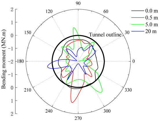 Figure 7 shows the change of the peak bending moment of the lining at the location of the y = 500 m section with different thicknesses of the adverse zone. It can be found that the distribution of the bending moment is also not consistent in all directions of the tunnel cross section. The distribution of the lining moment at 0.5 m thickness is similar to that without the adverse zone. If the thickness of the adverse zone is 5 m, the lining at the top and bottom right of the tunnel is under tension, while the lining at other locations is under compression. If the thickness of the adverse zone is 20 m, except that the lining at the left waist of the tunnel is under tension, all other parts are under compression. Generally, the lining moment is greater with the adverse geological structure zone than that without the adverse zone, and when the thickness of the adverse zone is 20 m, the lining suffers the greatest moment.
