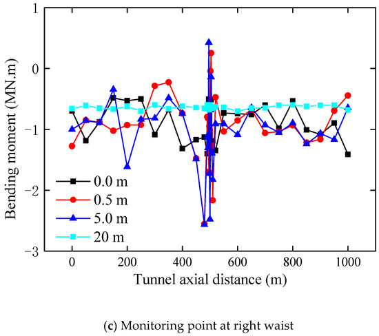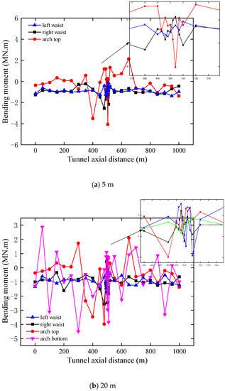 Figure 8 shows the variation of the peak bending moment of the lining monitoring points (also including the left and right waist, top and bottom) along the tunnel axis with different thicknesses of the adverse zone. As can be seen from Figure 8a, if the thickness of the adverse zone is 5 m, the bending moment of the monitoring point at the top of the lining is smaller than that of the other monitoring points. However, around the adverse zone, the peak moment and the degree of variation of the bending moment at this point are larger than those at the other monitoring points. Meanwhile, the bending moment of all monitoring points fluctuates significantly around the adverse zone. Although the difference between the bending moment peaks at the left and right waist monitoring points is small, the pace of their changes is not the same. If the thickness of the adverse zone is 20 m, the trend of the peak bending moment of the lining monitoring points in each part of the tunnel is not consistent with that of 5 m thickness. The bending moment curves at the left and right waist monitoring points are opposite. Overall, the bending moment at the bottom monitoring point changes most violently, with positive and negative bending moments changing continuously along the tunnel axial direction. In addition, the bending moment at all monitoring points fluctuates particularly strongly around the adverse zone, especially at the bottom and top two monitoring points, where the variation value is about 5 . From the comparative analysis in Figure 8c, it can be seen that the bending moment of the lining is stable at about 0.65 without the adverse geological structure zone. However, when an adverse geological structure zone exists, the variation degree of the tunnel-lining bending moment along the tunnel axis is significantly larger than that without the adverse zone. The bending moment shows strong inconsistency, and the maximum bending moment even reaches 2.6 . From the tunnel entrance to the adverse zone, the greater the thickness of the adverse zone, the more severe the change of the peak bending moment along the tunnel axis is. However, the difference is tiny from the adverse zone to the tunnel exit section, and the lining bending moment is generally stable in the range of 0.65~1.25 . It states that the adverse geological structure zone can play a damping role in the subsequent tunnel to a certain extent.