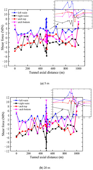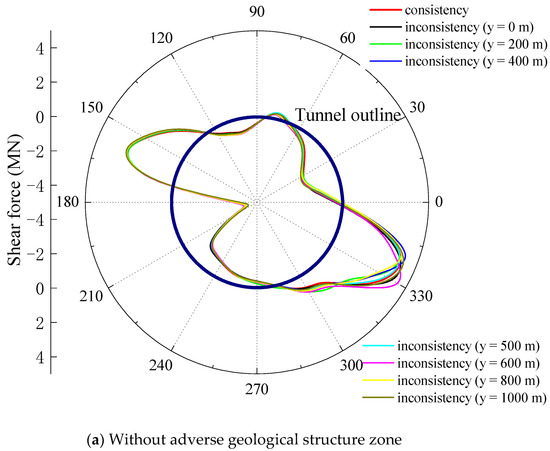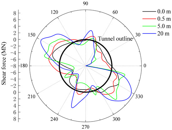 Figure 12 shows the variation of the peak shear force of the lining at the location of the y = 500 m section with different thicknesses of the adverse zone. It can be found that the distribution of the shear force is also the same in all directions of the tunnel cross section. On the whole, the lining shear force with the adverse geological structure zone is bigger than that without the adverse zone. Further, the greater the thickness of the adverse zone, the greater the lining shear force is, especially if the thickness of the adverse zone is 20 m, the maximum value of the positive and negative lining shear force is at least 2 MN. larger than that of other cases.