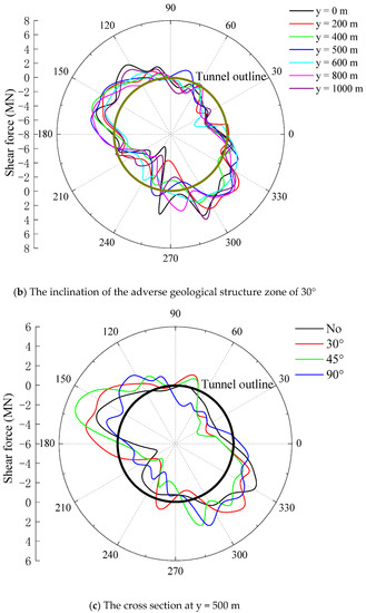 Shear force of lining of the tunnel passing through adverse geological structure zone with different inclinations for each cross section along the tunnel axial direction.